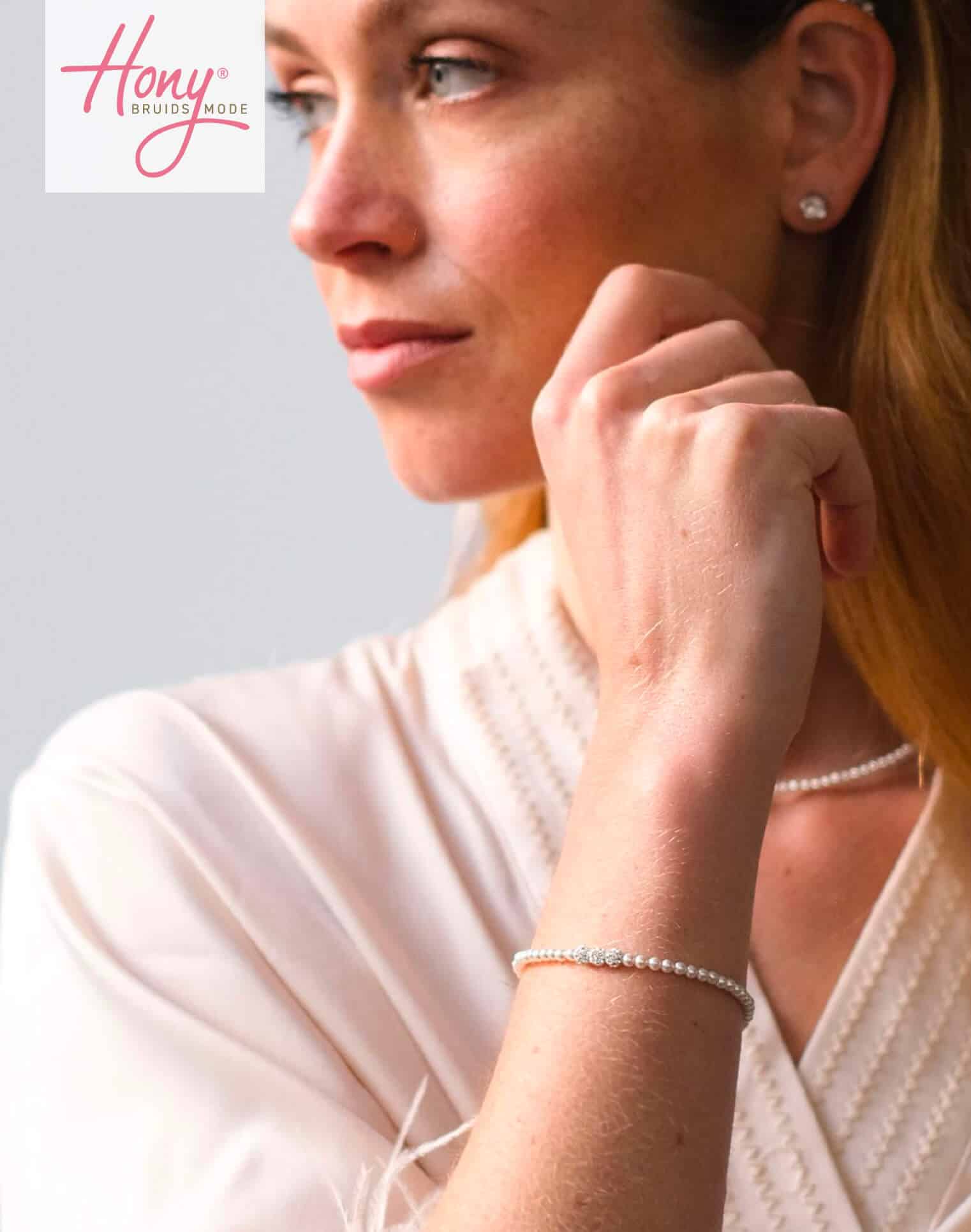 Elegante armband met zoetwaterparels. Versierd met kralen die zijn ingezet met swarovski stenen. Bij Hony Bruidsmode maken we met de mooiste accessoires het plaatje helemaal compleet!
