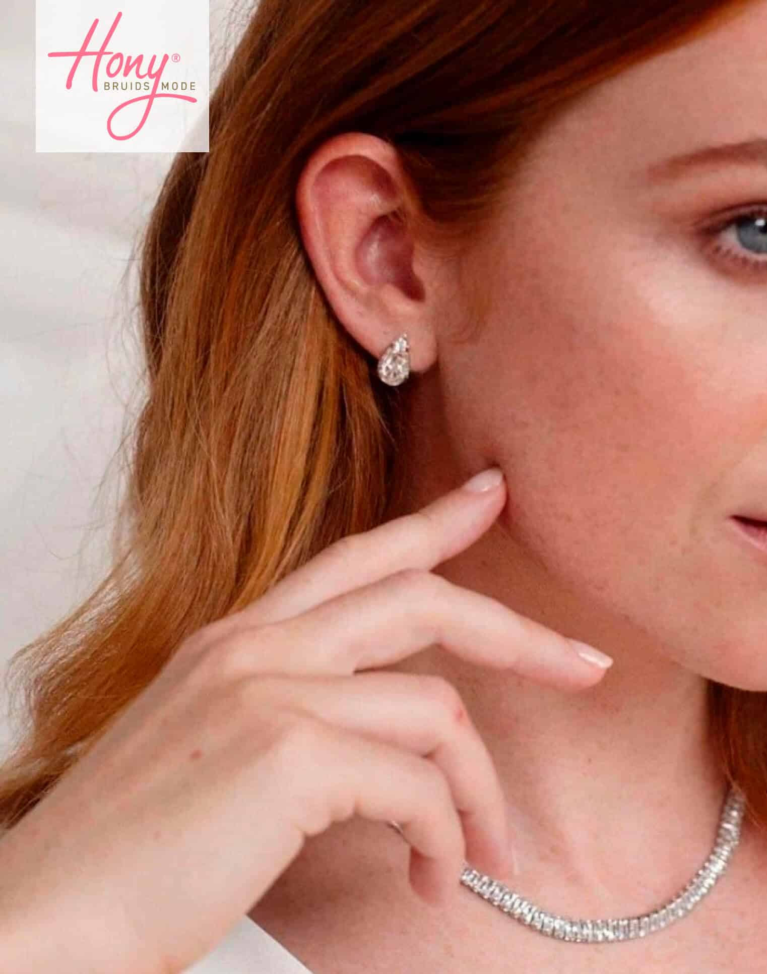 Elegante druppelvormige oorbellen met swarovski stenen. Bij Hony Bruidsmode maken we met de mooiste accessoires het plaatje helemaal compleet!