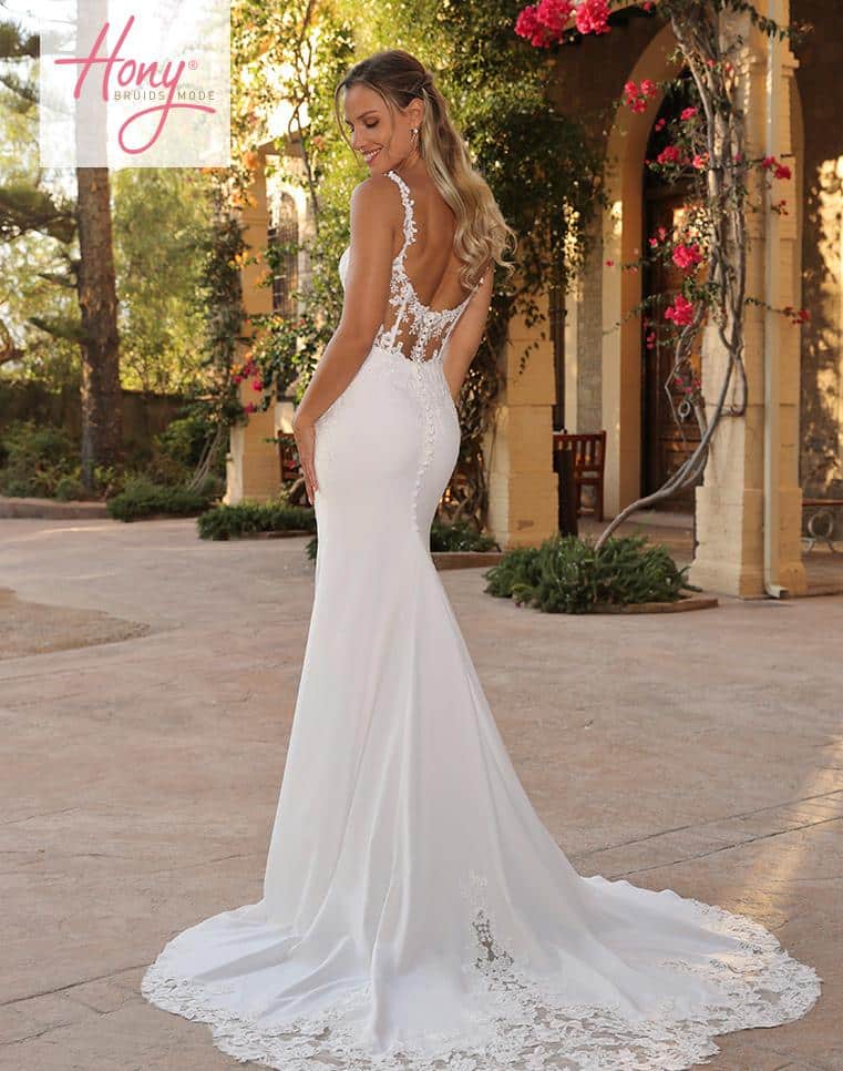 De Annelore trouwjurk straalt klassieke elegantie met een moderne twist uit. Gemaakt van zacht crêpe-satijn en gedrapeerd voor een flatterend silhouet, heeft deze jurk afneembare mouwen die flexibiliteit bieden in je look. De illusie rug en subtiele split in de rok geven een eigentijds randje aan deze tijdloze stijl. Annelore is perfect voor de bruid die houdt van verfijning en eenvoud, zonder concessies te doen aan stijl en details. Het gedrapeerde crêpe-satijn zorgt voor een prachtig vloeiende pasvorm die comfortabel is om te dragen, terwijl de moderne accenten zorgen voor een subtiele maar opvallende look.