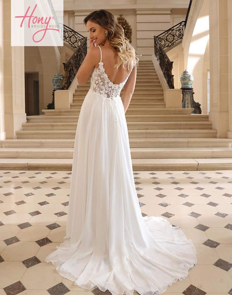 Aubree is de ultieme jurk voor de bruid die verlangt naar een romantische en luchtige look met moderne finesse. De delicate, transparante top met bloemenkant in 3D-effect en spaghettibandjes straalt vrouwelijkheid en zachtheid uit. De flowy chiffon rok met hoge split zorgt voor een subtiele sexy touch, terwijl de lage ruglijn met zachte lijnen een elegante silhouet creëert. Licht, luchtig en onweerstaanbaar romantisch.