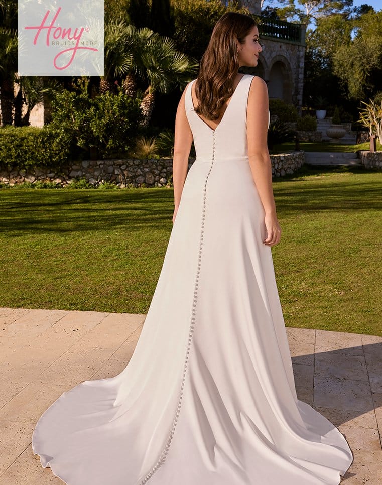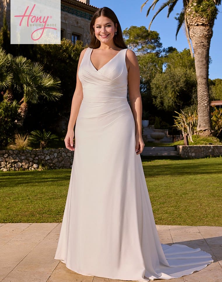 Een verfijnde A-lijn jurk in zachte satijn met V-hals en V-rug – perfect voor curvy bruiden die elegantie en comfort willen combineren.